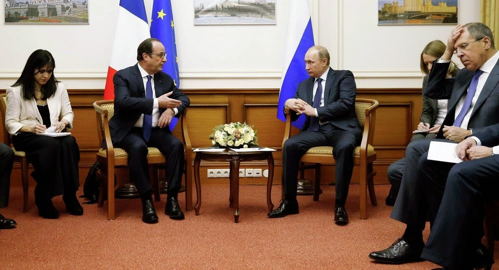 My Comment: German Chancellor Merkel was always the European representative who had one-on-one talks with Putin .... but that relationship has grown cold. It looks like French President Hollande is now the European leader who has been given the job of having one-on-one talks with Putin .... which probably suits Hollande fine .... especially since he knows that the onus is on him to act in smoothing France's relationship with Russia over the Mistral contract debacle.