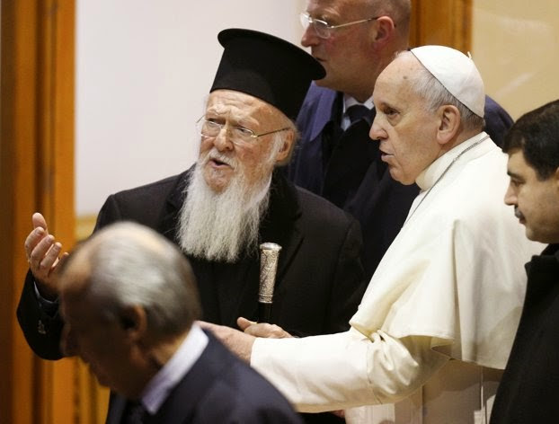 Ecumenical Patriarch Bartholomew I of Constantinople (2L) accompanies Pope Francis as he departs from Istanbul after a three day visit, November 30, 2014. Pope Francis said Islamic militants were carrying out a "profoundly grave sin against God" in Syria and Iraq, calling on Sunday for inter-religious dialogue and action against poverty to help end the conflicts there. REUTERS/Stoyan Nenov